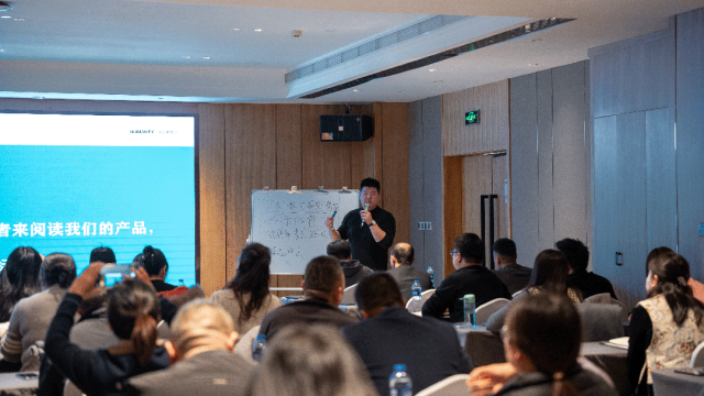 產品,是品牌最好的代言,自然也成為本次研學之旅的重要環節。羅曼締克品牌銷區經理-郭彩宏就2024主推工藝及產品矩陣等內容,從美學巖板、大理石、白韻石到素色質感磚等,羅曼締克不僅在產品設計上追求突破,更在工藝技術、材料應用等方面進行持續創新,率先打造以全品類、全規格的產品銷售鏈路,形成獨一的品牌核心競爭力,明確品牌2024年產品打法思路。