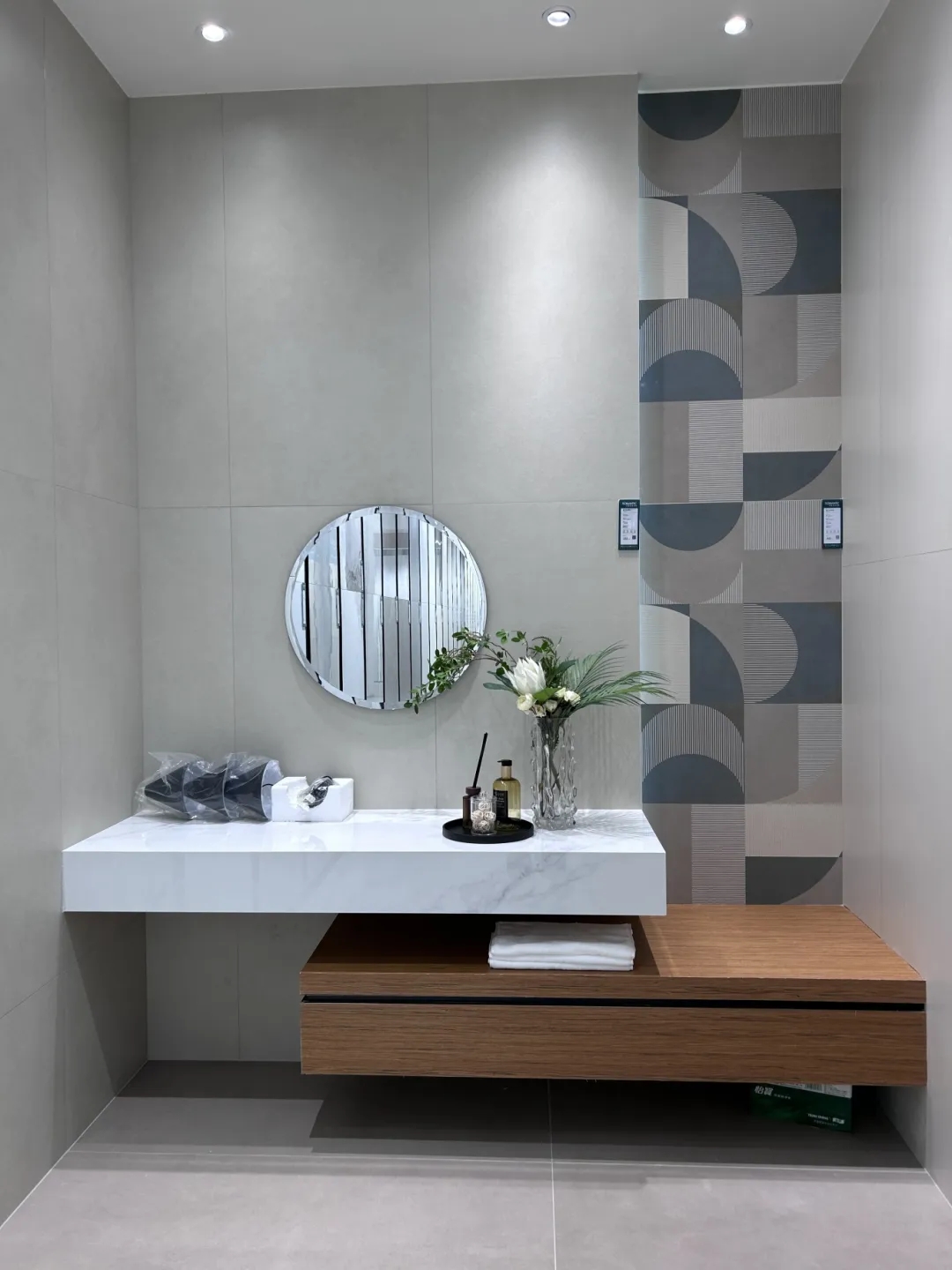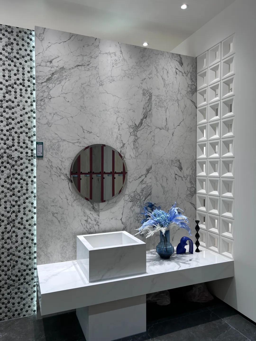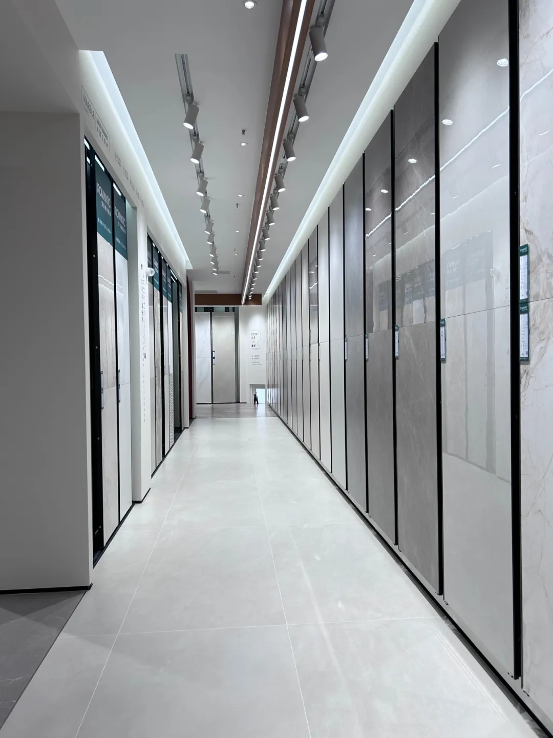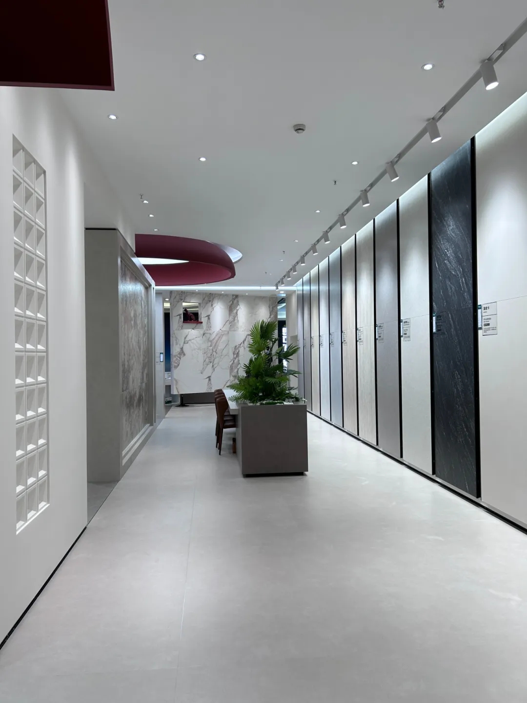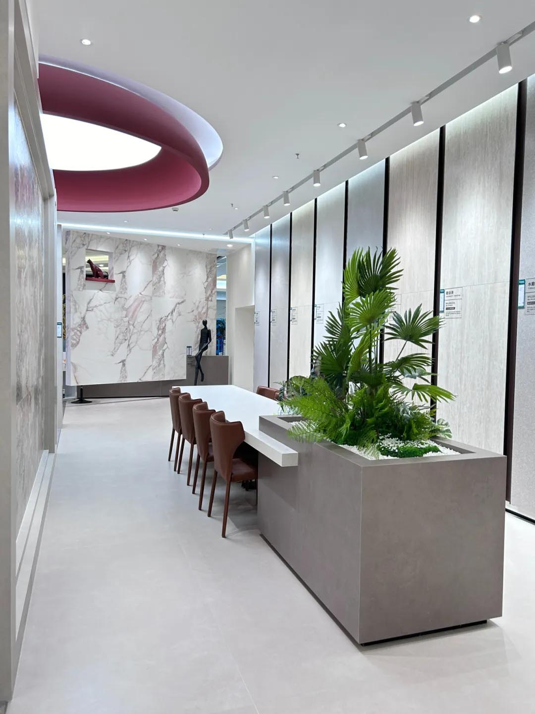 選材區(qū)承載著單品瓷磚展示的功能,以材質(zhì)為界面,簡潔的體塊與理性的線條將不同系列的板材區(qū)域巧妙換分,提升選品體驗(yàn)感。